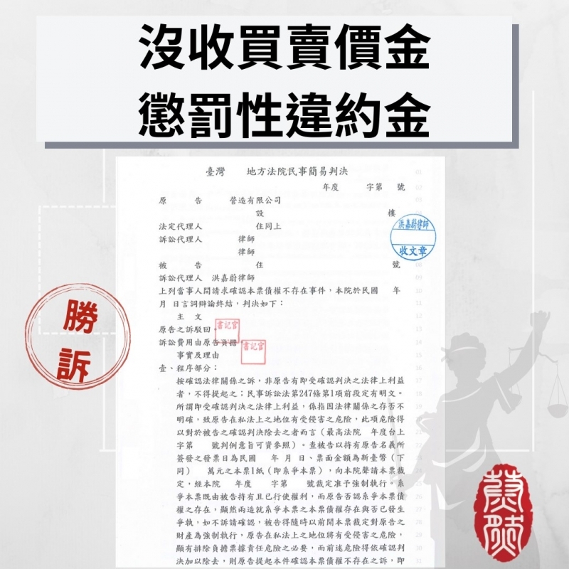 當事人出售不動產,買賣雙方已經履約保證契約上載明違約會將已付價金沒收作為懲罰性違約金,買方不僅違約辯稱沒有授權,還提告沒收的票據債權不存在